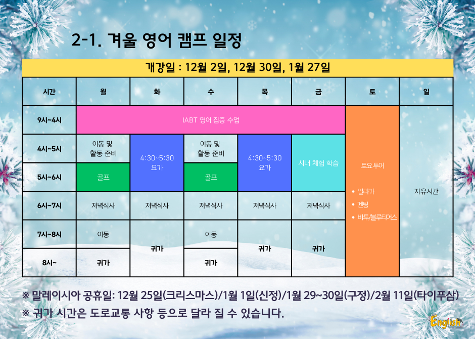 여름 영어 캠프의 성공에 이어, 겨울 영어 캠프 역시 큰 인기를 끌고 있습니다. IABT는 최신식 시설을 자랑하며, 쉐라톤 임페리얼 쿠알라룸푸르 호텔 내에서 열립니다.