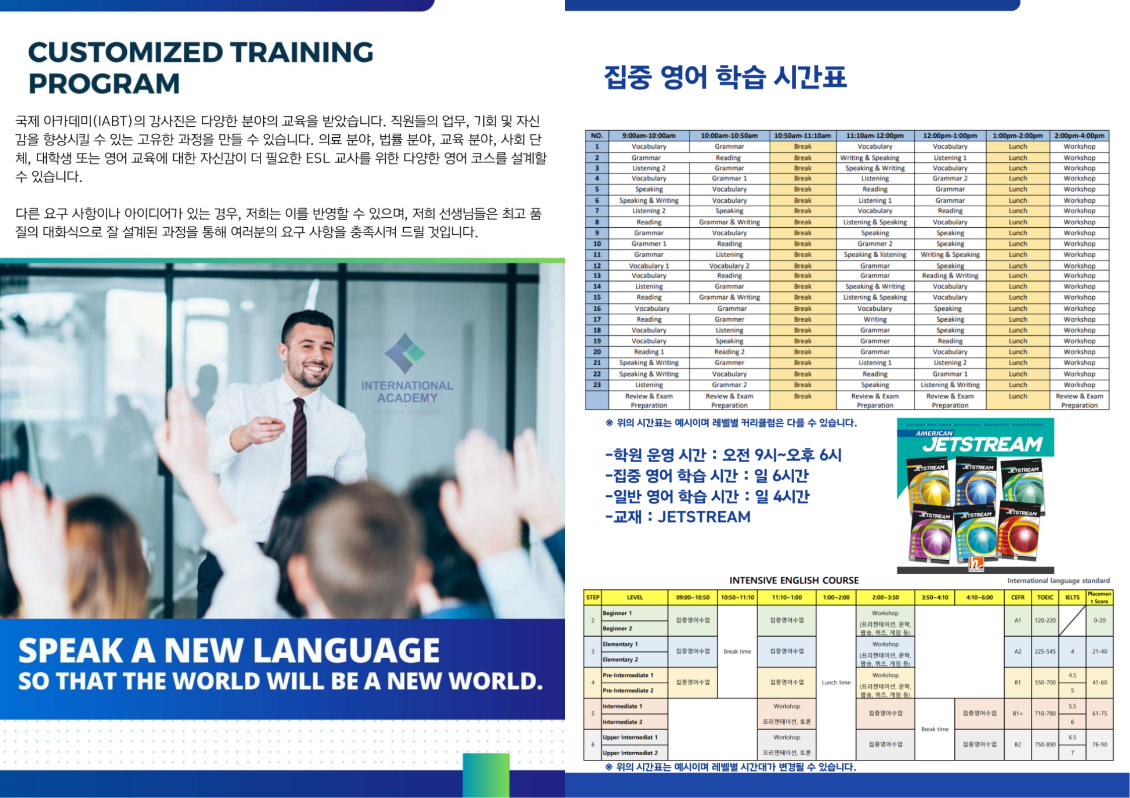 IABT는 오전 9시부터 오후 6시까지 운영되며, 하루 6시간의 집중 영어 학습 프로그램과 4시간의 일반 영어 학습 프로그램을 제공합니다. 학생들은 최신 JETSTREAM 교재를 통해 효과적으로 영어 실력을 향상시킬 수 있으며, 개개인의 목표에 맞춘 학습을 진행합니다.