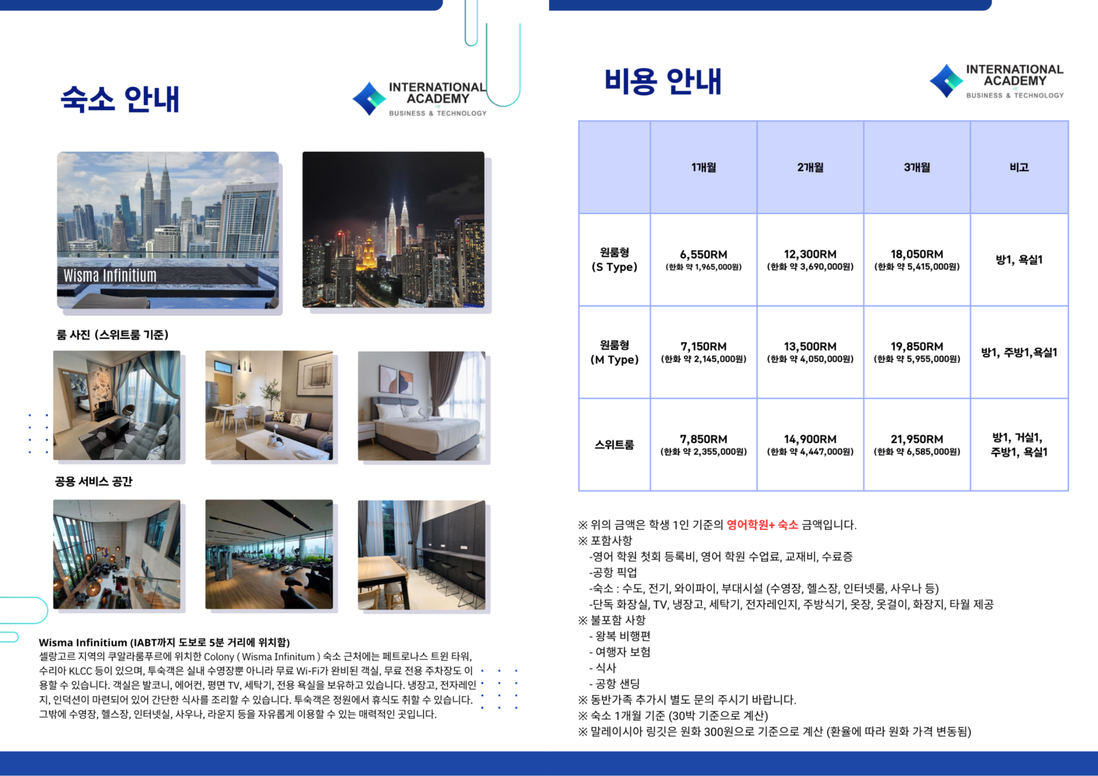 IABT는 학원과 도보로 5분 거리에 위치한 Wisma Infinitium 숙소를 제공하여 학생들이 편리하고 쾌적한 생활을 할 수 있도록 돕습니다. 이 숙소는 페트로나스 타워와 KLCC 쇼핑몰 근처에 있으며, 실내 수영장, 헬스장, 사우나 등의 부대시설도 이용할 수 있습니다. 각 객실은 무료 Wi-Fi, 발코니, 에어컨, 평면 TV, 세탁기, 전용 욕실 등을 갖추고 있으며, 간단한 식사 준비를 위한 주방 시설도 마련되어 있습니다.