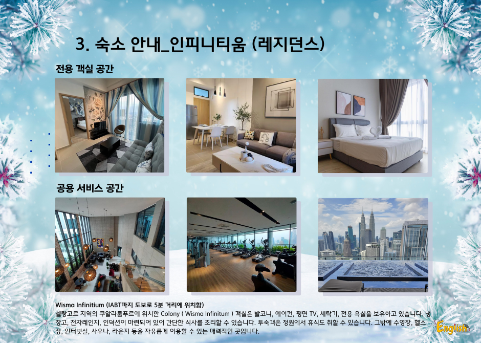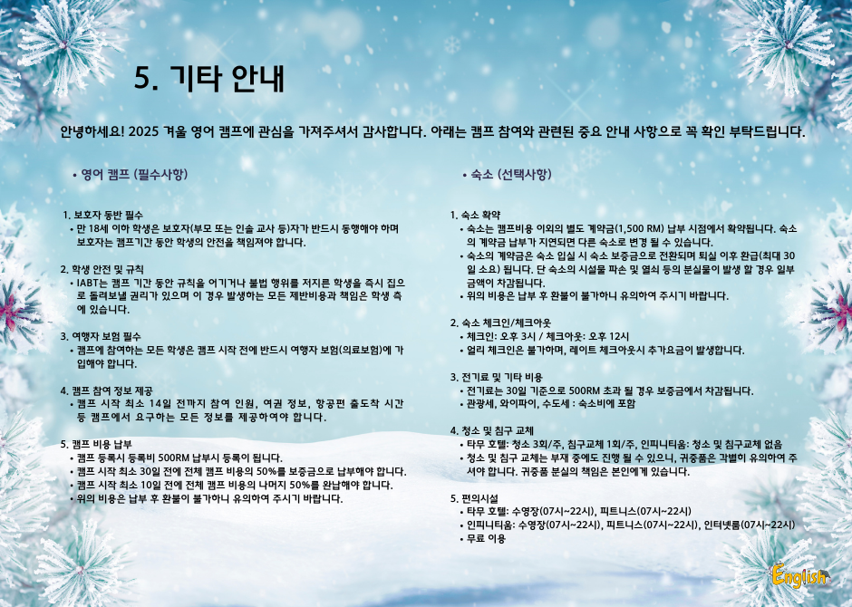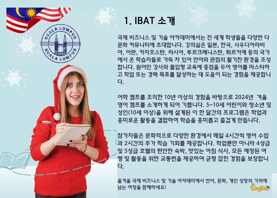여름 영어 캠프의 성공에 이어, 겨울 영어 캠프 역시 큰 인기를 끌고 있습니다. IABT는 최신식 시설을 자랑하며, 쉐라톤 임페리얼 쿠알라룸푸르 호텔 내에서 열립니다.