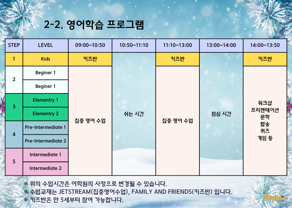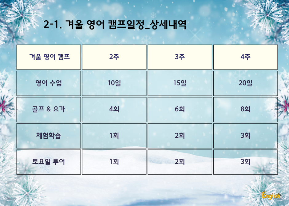 참가자들은 원어민 영어 강사와 함께 집중적인 영어 학습 환경에 몰입하게 됩니다. 프로그램에는 다음과 같은 내용이 포함되어 있습니다: